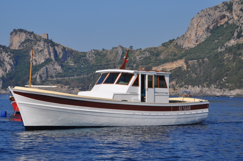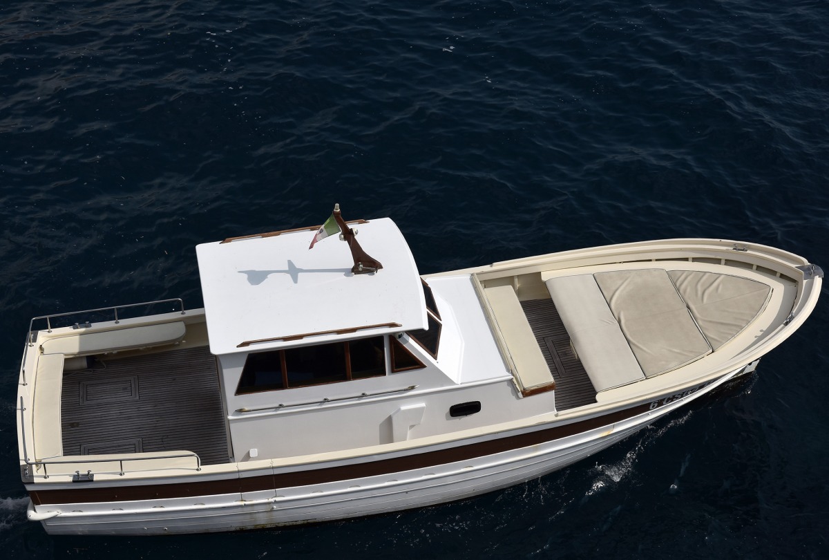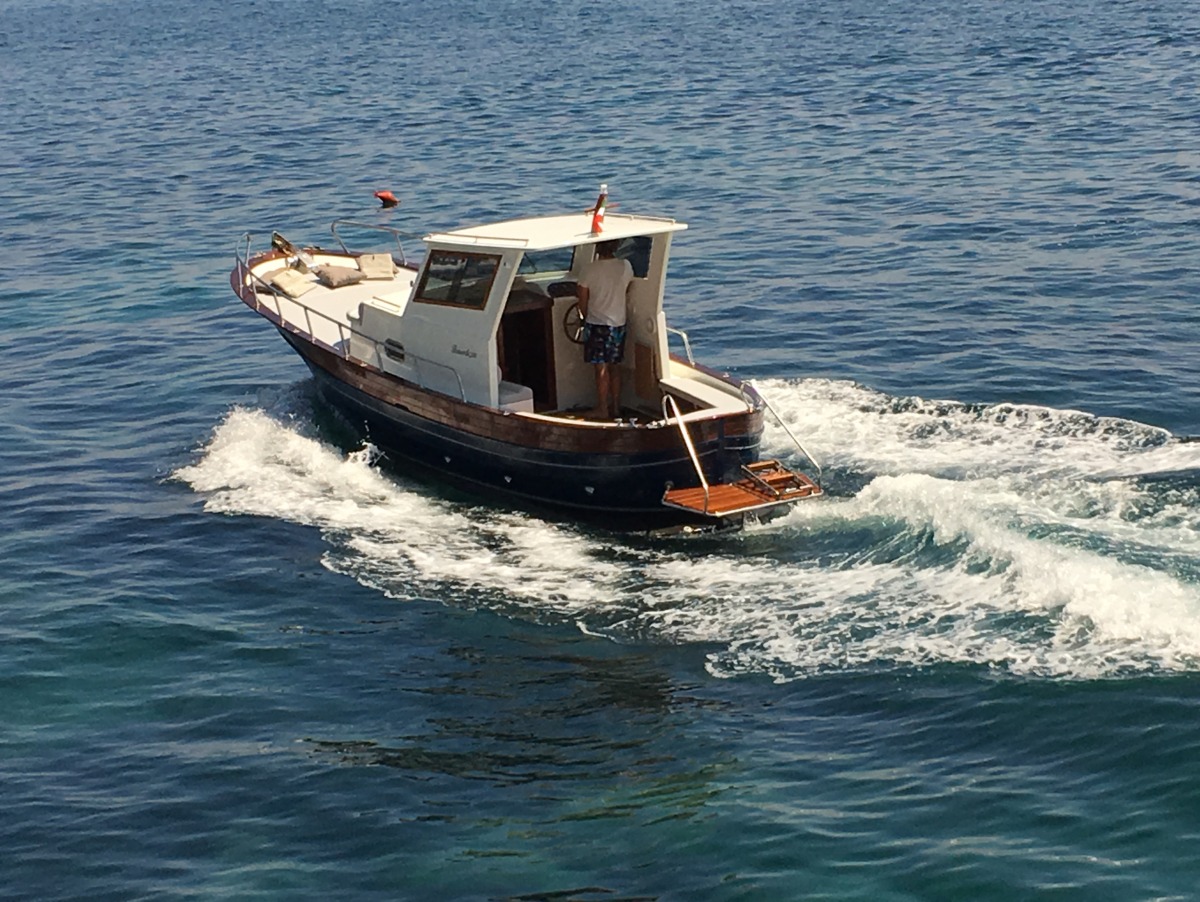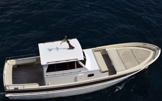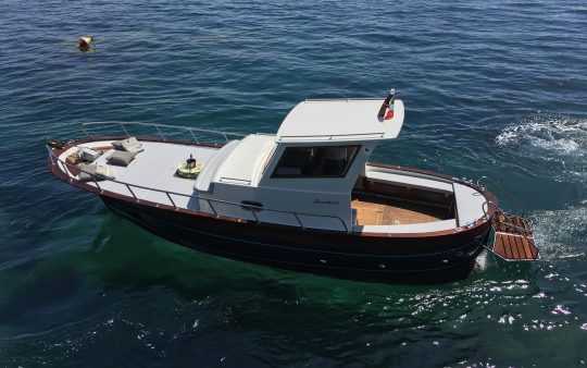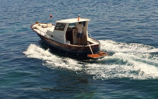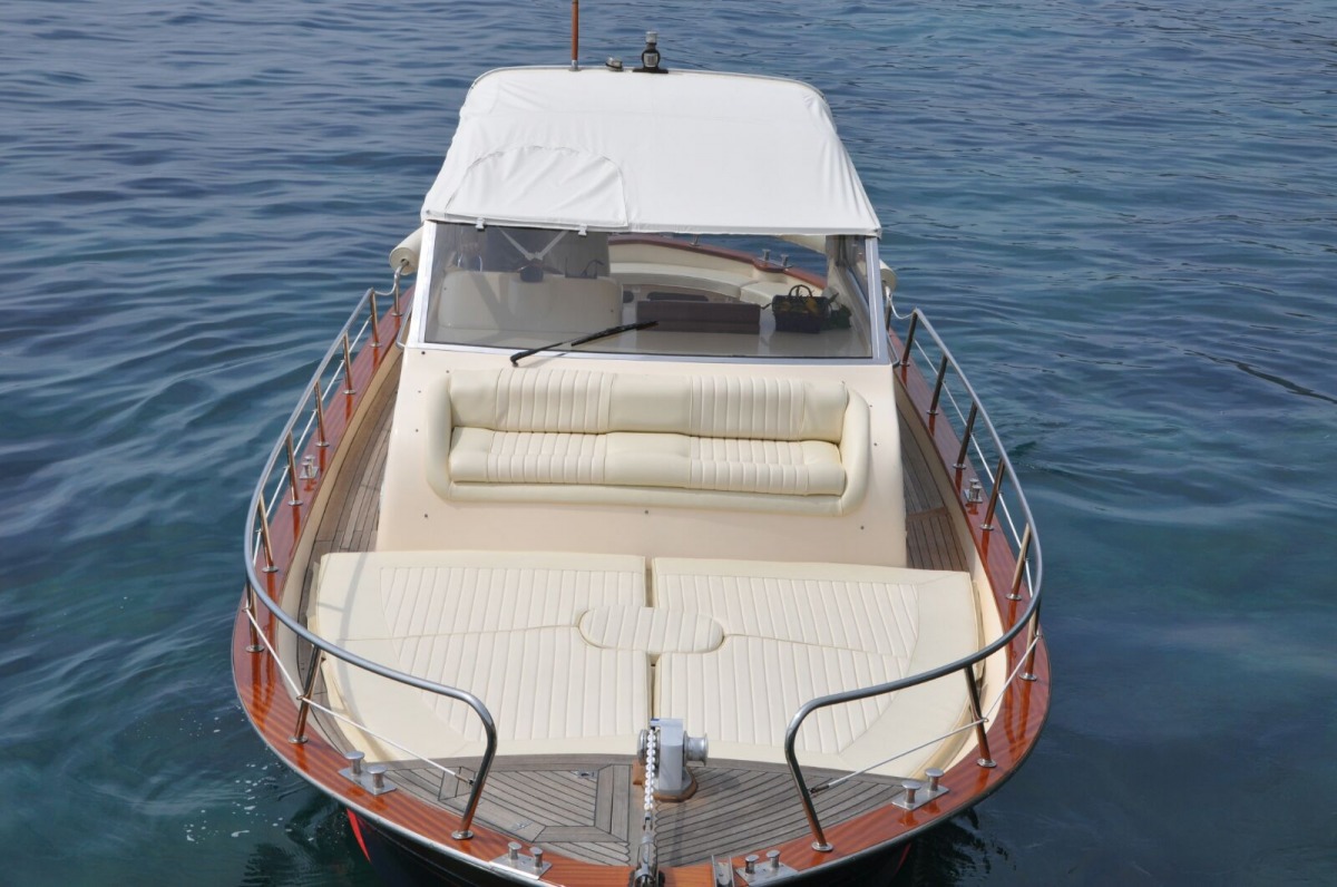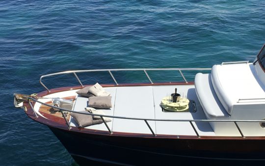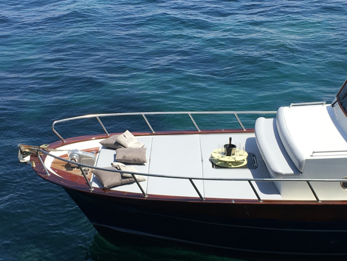 The typical boat of the Sorrento Peninsula, with wide sundeck and sofa at bow to admire the landscape in full comfort.