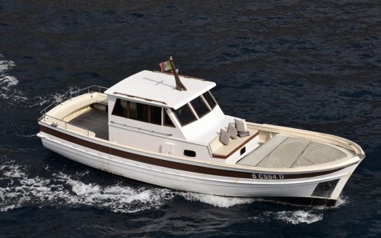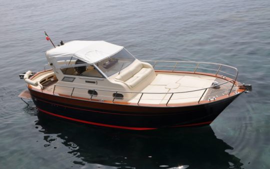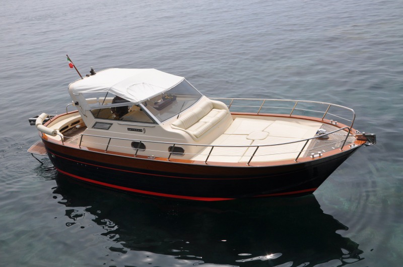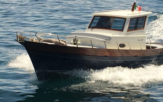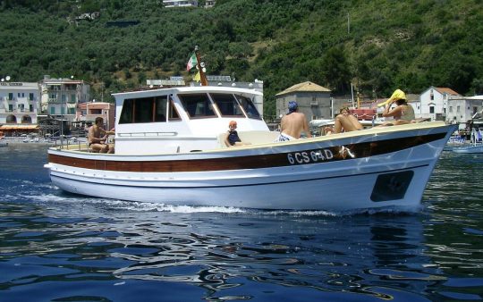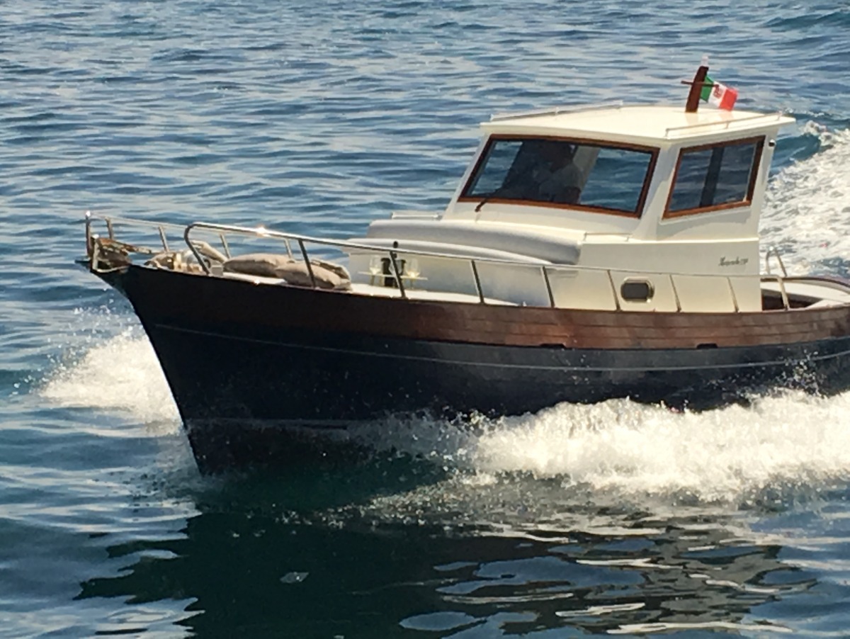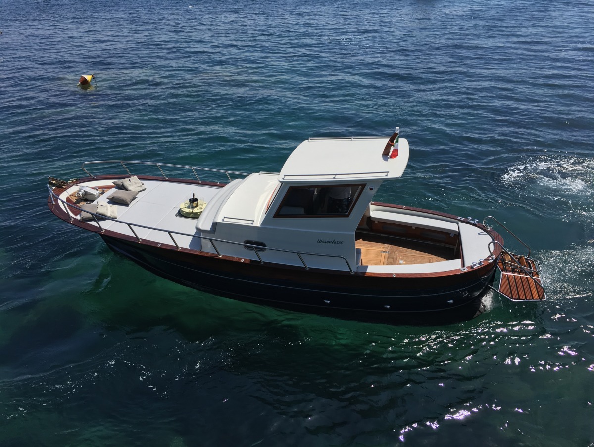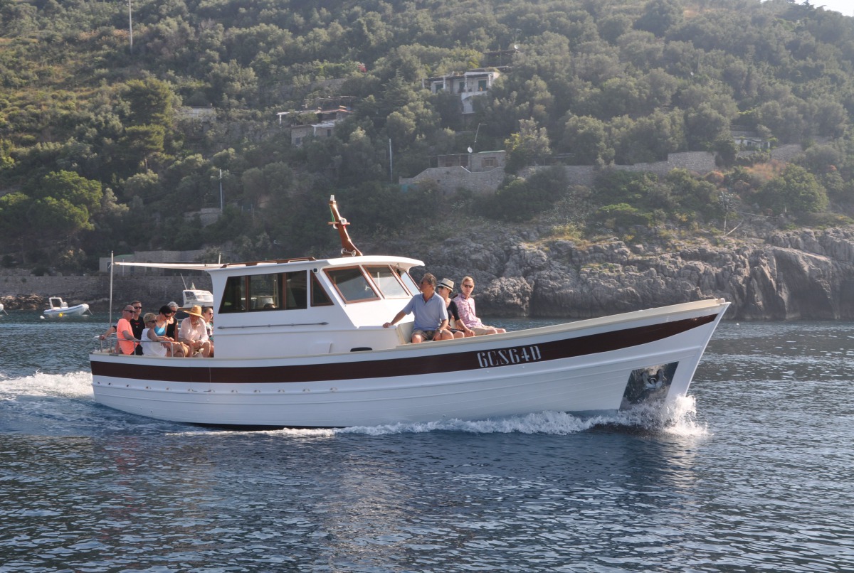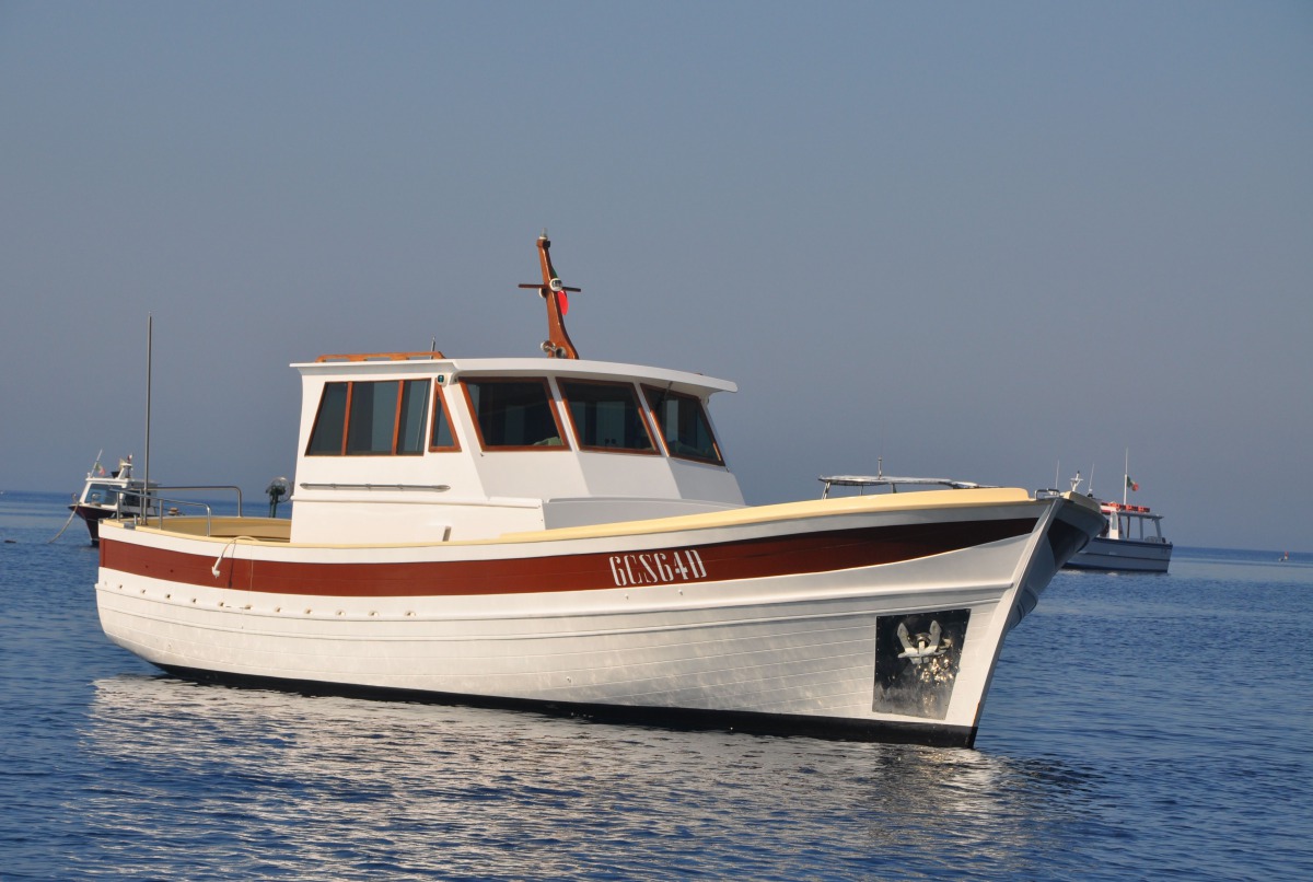 The typical boat of the Sorrento Peninsula, with wide sundeck and sofa at bow to admire the landscape in full comfort.