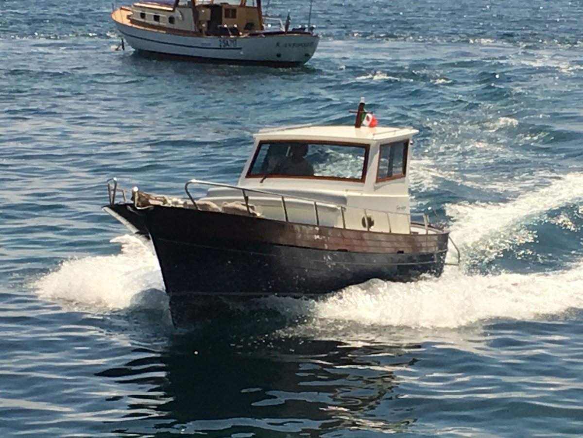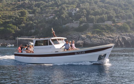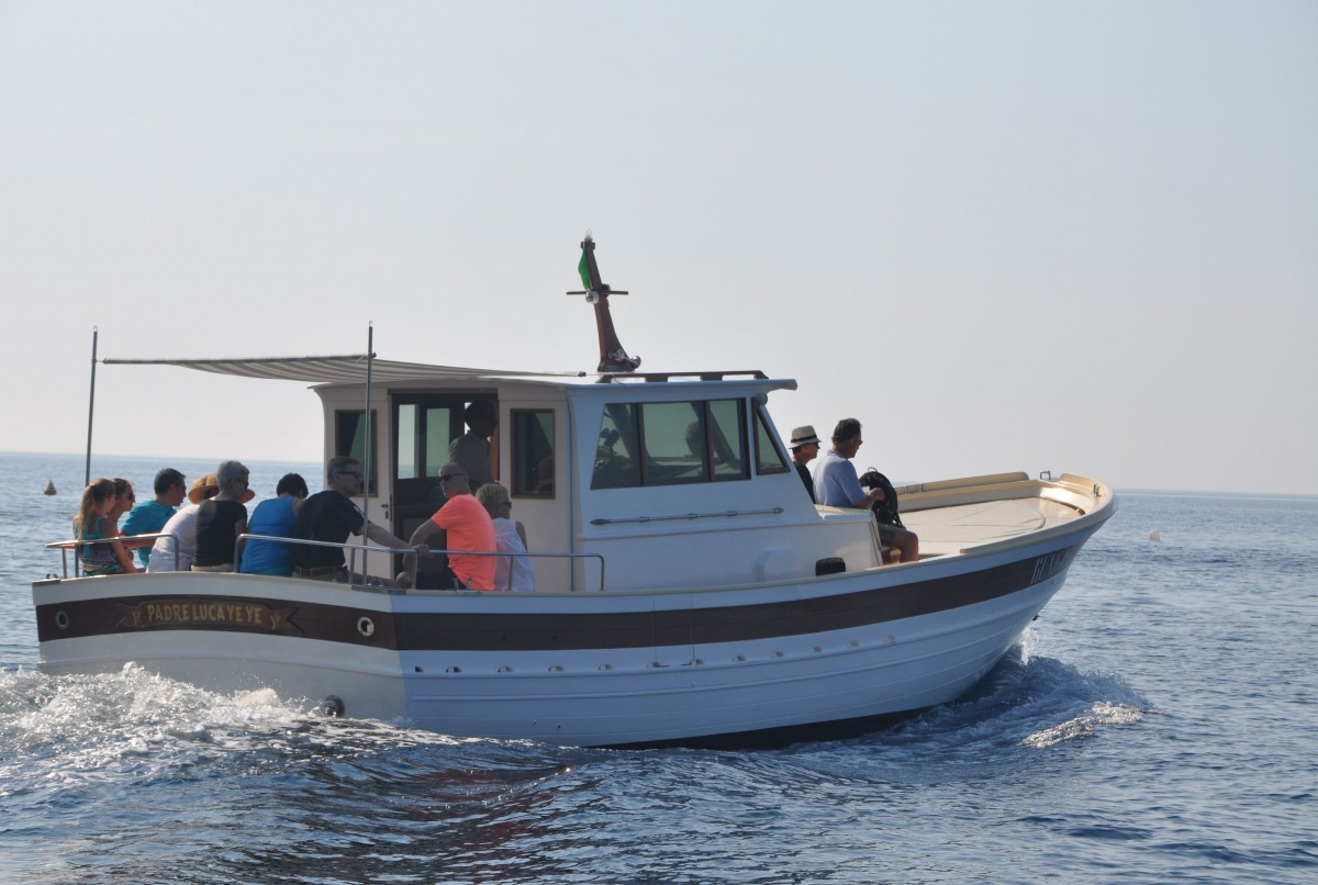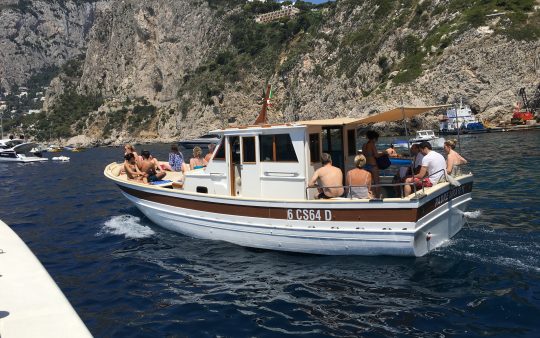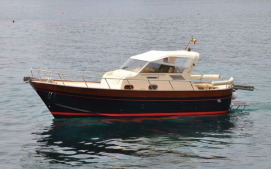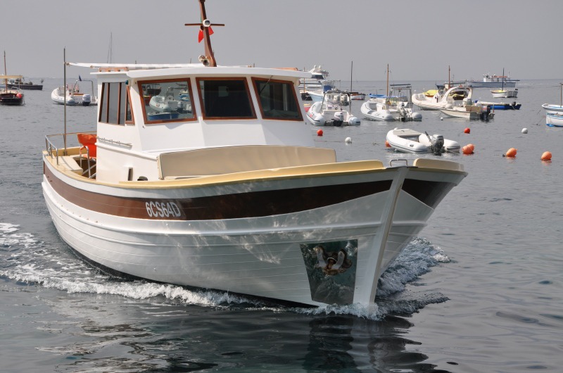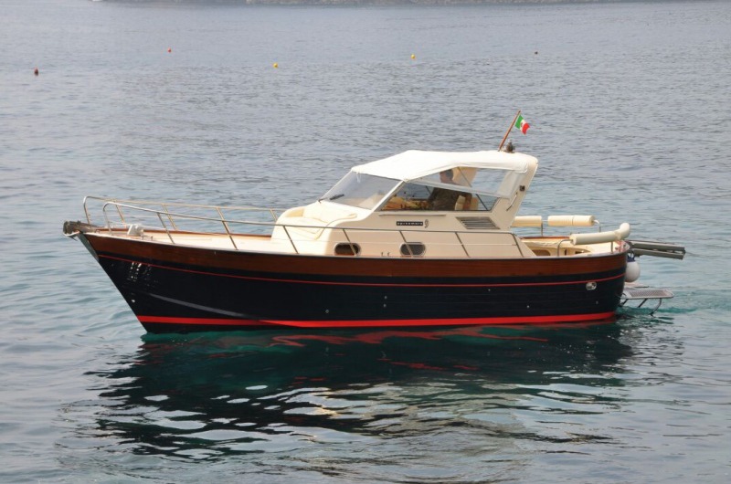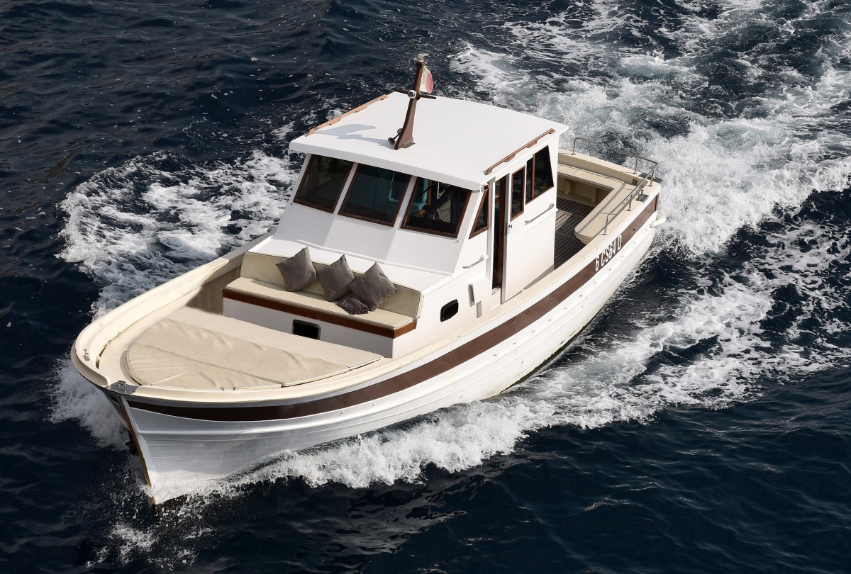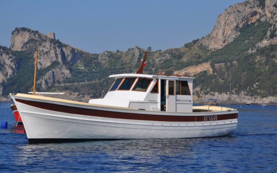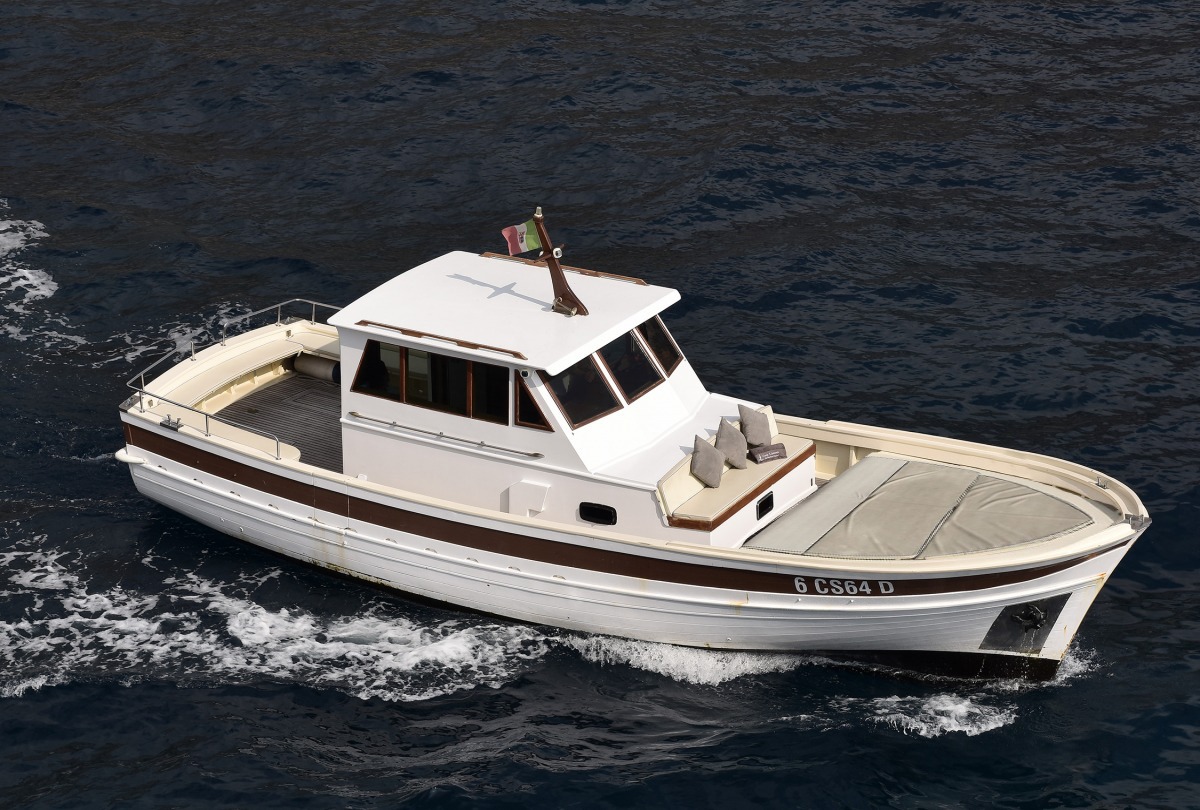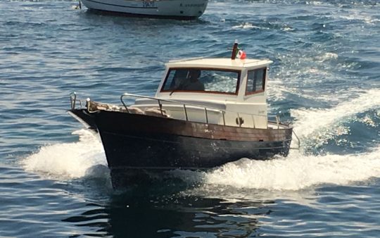 The typical boat of the Sorrento Peninsula, with wide sundeck and sofa at bow to admire the landscape in full comfort.