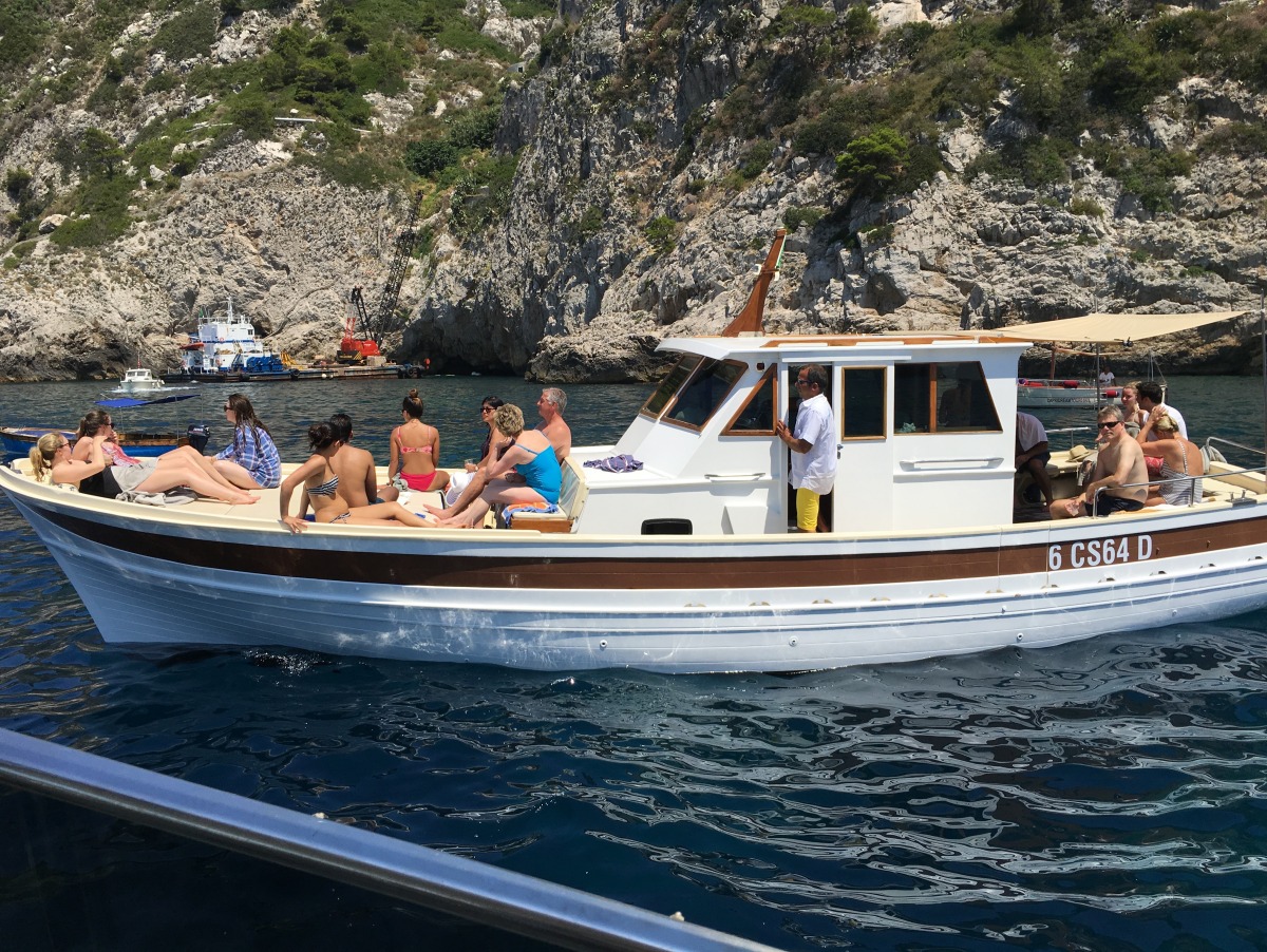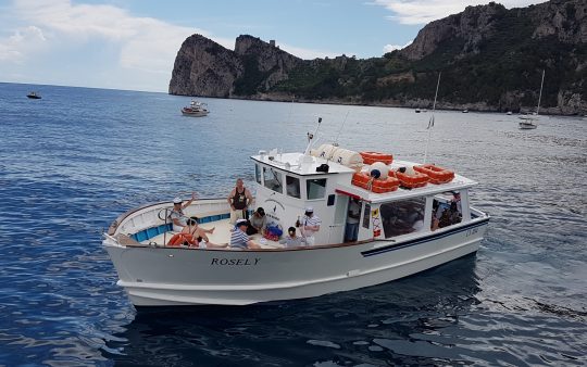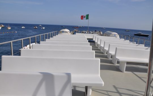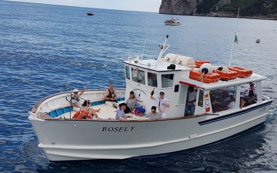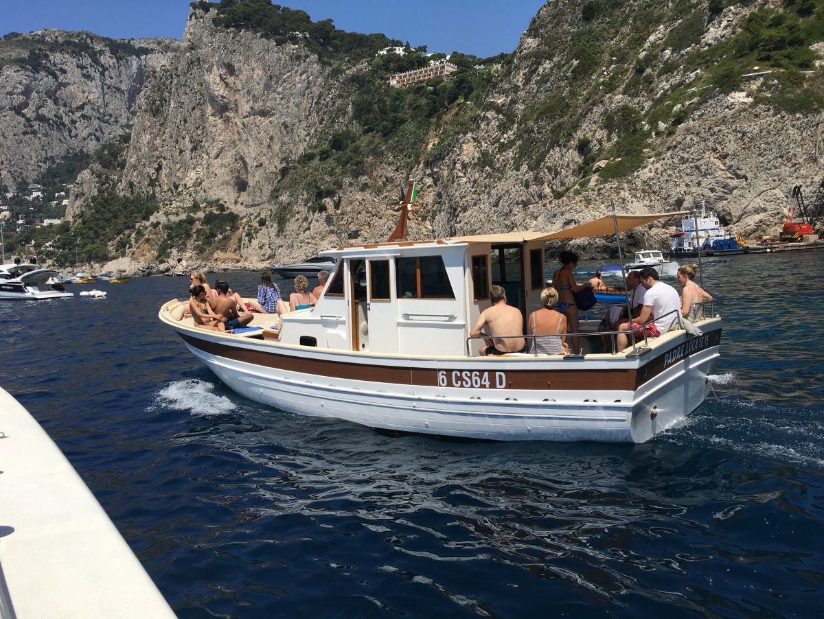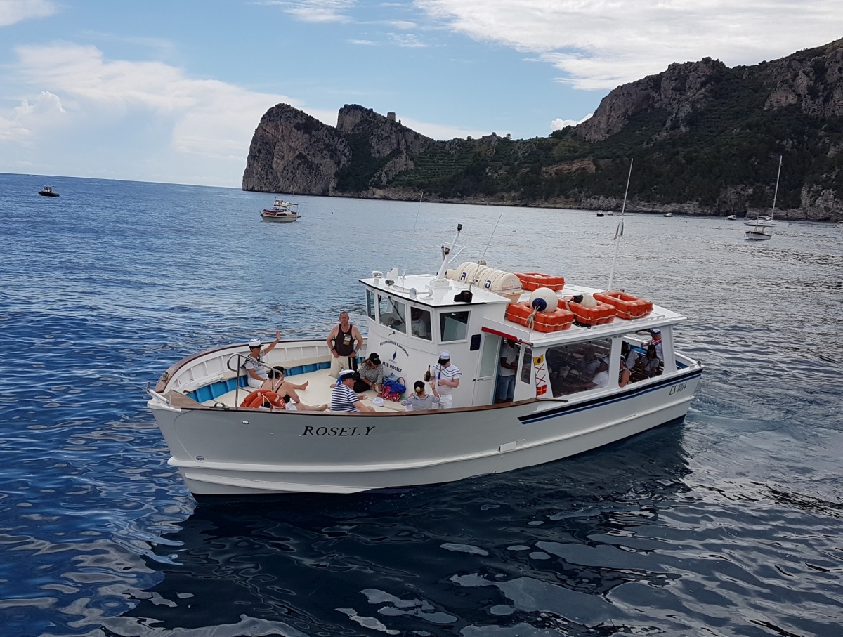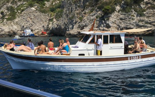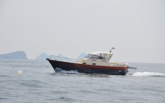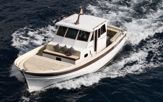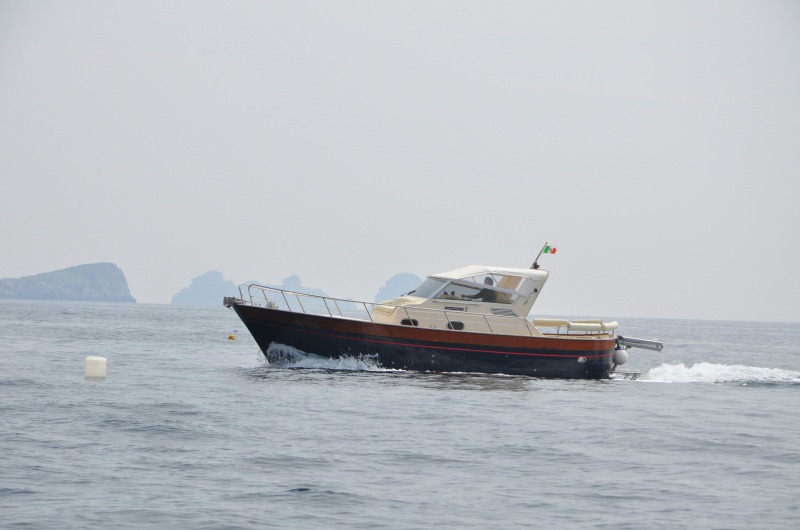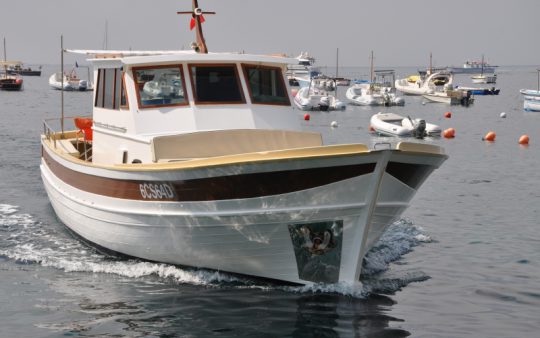 The typical boat of the Sorrento Peninsula, with wide sundeck and sofa at bow to admire the landscape in full comfort.