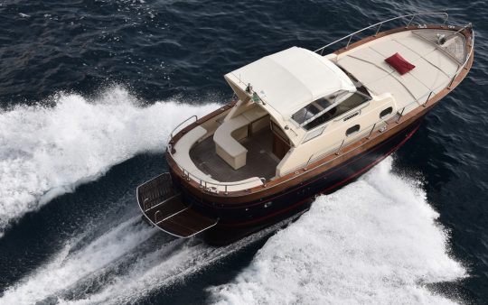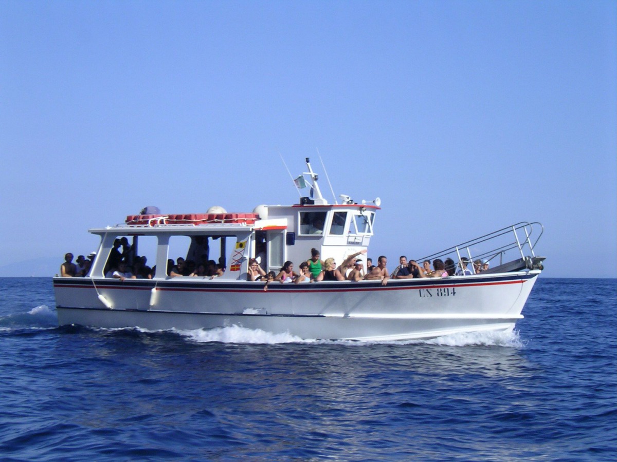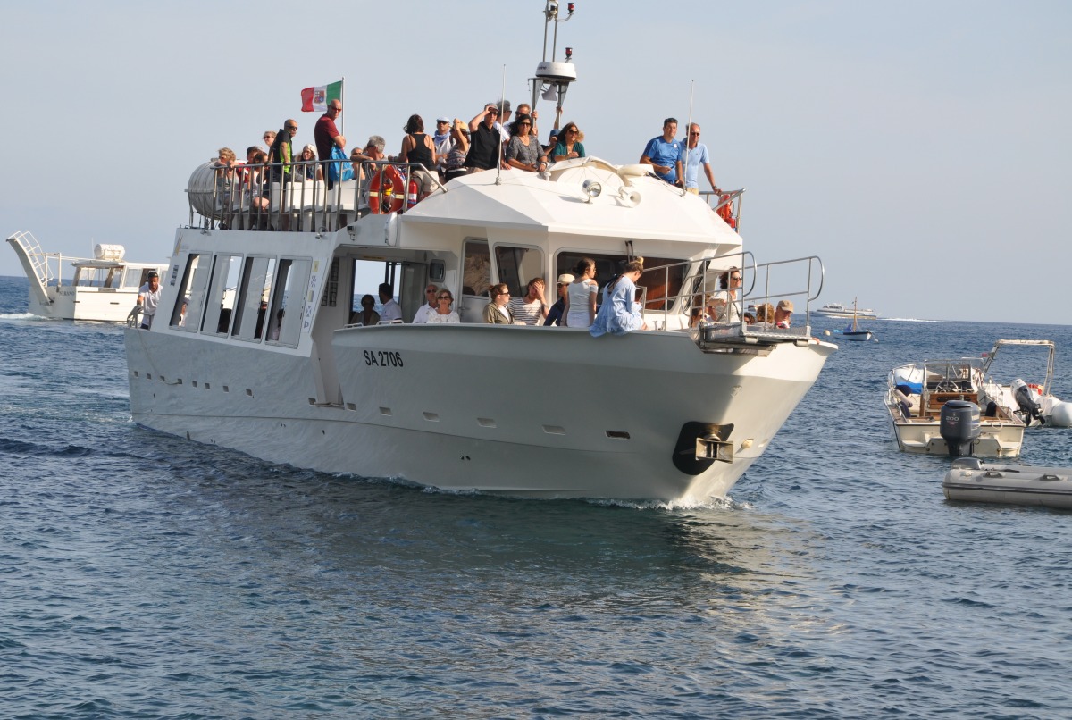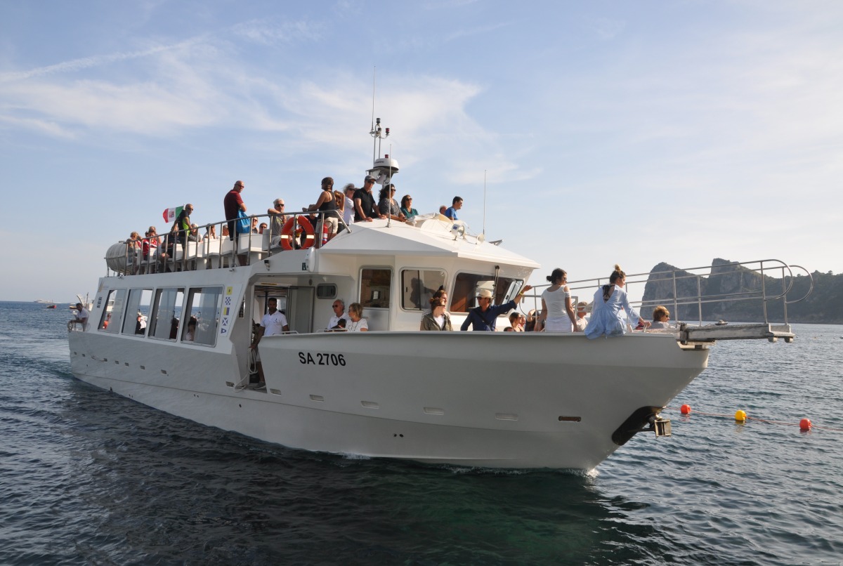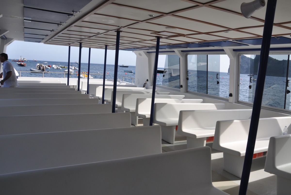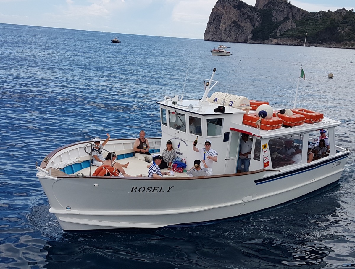 The typical boat of the Sorrento Peninsula, with wide sundeck and sofa at bow to admire the landscape in full comfort.